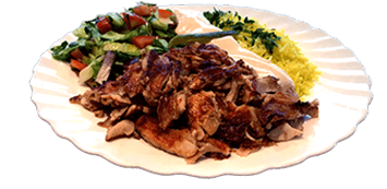 Gemischter Salat mit Tomate, Gurke, Zwiebeln, Hähnchen-Schawarma und Reis